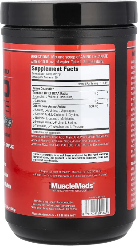 آمینو دکانات ماسل مدز MuscleMeds Amino Decanate یکی از عالی ترین مکملهای آمینواسیدی برای عضلهسازی، ریکاوری سریع و افزایش عملکرد ورزشی است. این مکمل با تکنولوژی انحصاری DecaDrive تولید شده که باعث جذب فوقالعاده سریع و کامل آمینواسیدها در بدن میشود.این محصول ترکیبی قدرتمند از BCAA با نسبت آنابولیک 10:1:1، گلوتامین خالص و یک ماتریس ویژه 500 میلیگرمی آمینواسیدی است و به همین دلیل در میان ورزشکاران حرفهای به عنوان یکی از موثرترین و پرطرفدارترین آمینوهای بازار شناخته میشود.