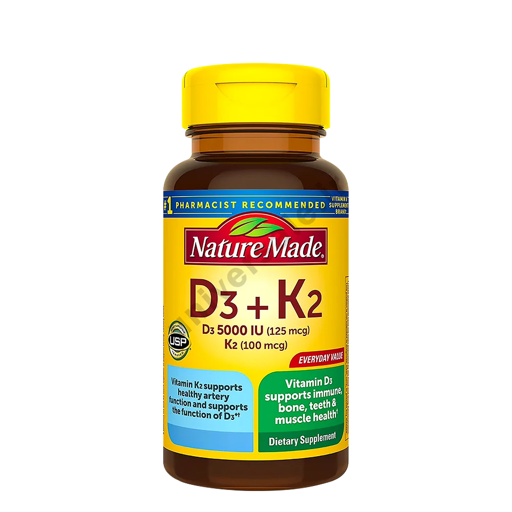 ویتامین D3 و K2 نیچرمید Nature Made Vitamin D3 + K2 Softgels یکی از موثرترین مکملهای سلامت استخوان و قلب در بازار جهانی است که با فرمولی علمی و دقیق، جذب کلسیم را بهینه کرده و از رسوب آن در عروق جلوگیری میکند.این محصول با دوز قوی D3 (5000 IU) به همراه ویتامین K2، انتخابی هوشمندانه و کاربردیترین مکمل برای افرادی است که به سلامت استخوان، دندان، عضلات و قلب خود اهمیت میدهند. کیفیت ساخت بالا و تأییدیه USP، این مکمل را به گزینهای مطمئن برای خرید بهترین مکمل D3 + K2 تبدیل کرده است.