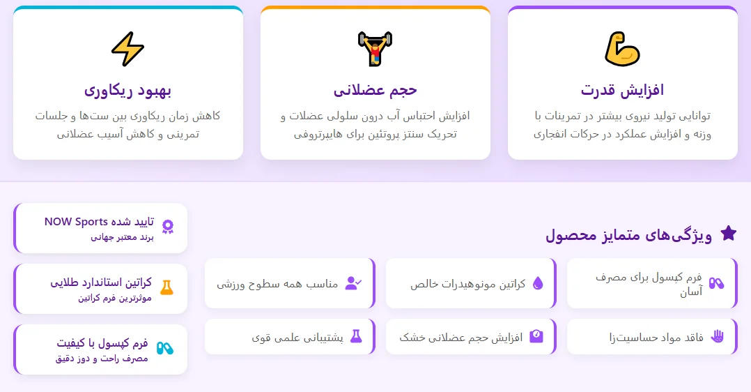 B.افزایش قدرت، حجم و استقامت عضلانی ,فرم کپسولی برای مصرف آسان و بدون نفخ