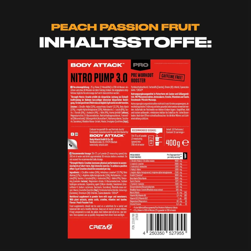نیترو پمپ بادی اتک Body Attack Nitro Pump 3.0 یکی از کاربردیترین مکملهای پمپ و پیشتمرین بدون محرک در بازار اروپا است که برای افزایش حجم عضلانی، پمپ انفجاری و تمرکز ذهنی طراحی شده است.این محصول با فرمول چندبخشی حرفهای (Neuro + Pump + Strength)، انتخابی ایدهآل برای ورزشکارانی است که به دنبال خرید یک پمپ قدرتمند بدون افت انرژی، بدون کرش و بدون وابستگی به کافئین هستند. Nitro Pump 3.0 مناسب تمرینات سنگین بدنسازی، کراسفیت و تمرینات قدرتی است.