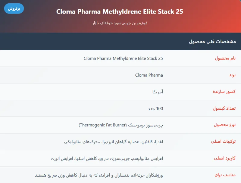 Methyldrene Elite: این محصول نیز یکی از فرمولهای پرقدرت Cloma Pharma است که با ترکیباتی چون افدرا، سینفرین، کافئین و سایر مواد چر