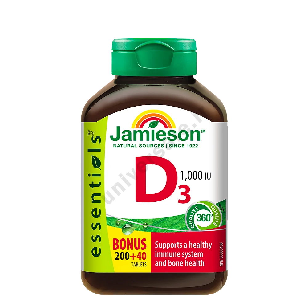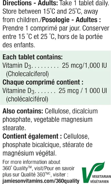 A.دوز استاندارد 1000 IU برای مصرف روزانه ,فرمولاسیون این مکمل با کیفیت تضمینشده Jamieson 360° Pure تولید شده و بدون گلوتن، لاکتوز و رنگ مصنوعی است.