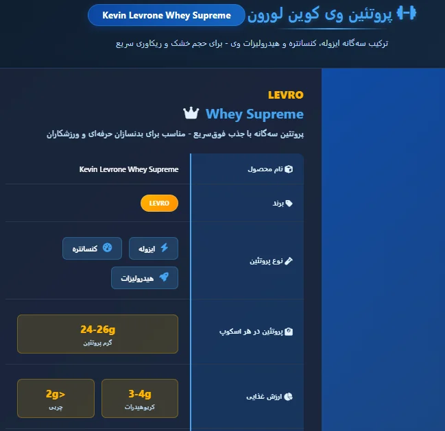 پروتئین وی سوپریم کوین لورون kevin levro whey supreme با طراحی و تأیید مستقیم کوین لورون (Kevin Levrone) – یکی از اسطورههای بدنسازی جهان – یکی از بهترین و موثرترین مکملهای پروتئینی موجود در بازار است.این محصول با ترکیب پیشرفتهای از وی ایزوله (WPI)، وی کنسانتره (WPC) و وی هیدرولیزات (WPH)، یک فرمول فوقالعاده قدرتمند برای ساخت عضله، افزایش سرعت ریکاوری و بهبود عملکرد ورزشی ارائه میدهد.این فرمول سهگانه باعث میشود هم جذب سریع داشته باشید (بلافاصله پس از تمرین) و هم جذب مداوم برای تغذیه کامل عضلات در طول روز.
