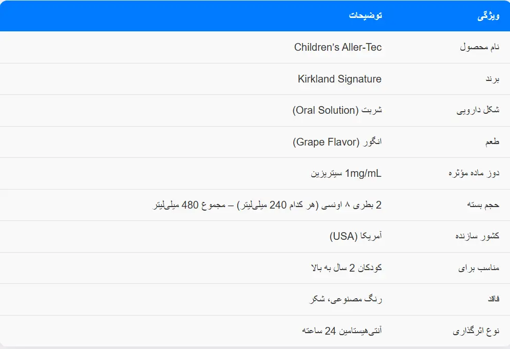 نکته: دوز دقیق باید بر اساس سن و وزن کودک توسط پزشک تعیین شود.این شربت با طعم دلچسب انگور، بدون رنگ و شکر اضافه، گزینهای مؤثر، ایمن و دوستداشتنی برای کودکان به شمار میرود و با اثر 24 ساعته خود از رایجترین علائم آلرژی مانند آبریزش بینی، عطسه و خارش چشم و گلو جلوگیری میکند.