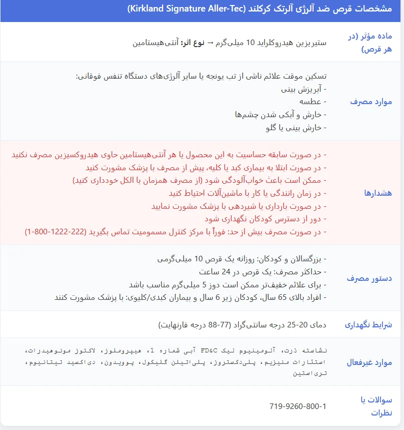 ویژگیهای قرص ضد آلرژی آلرتک کرکلند