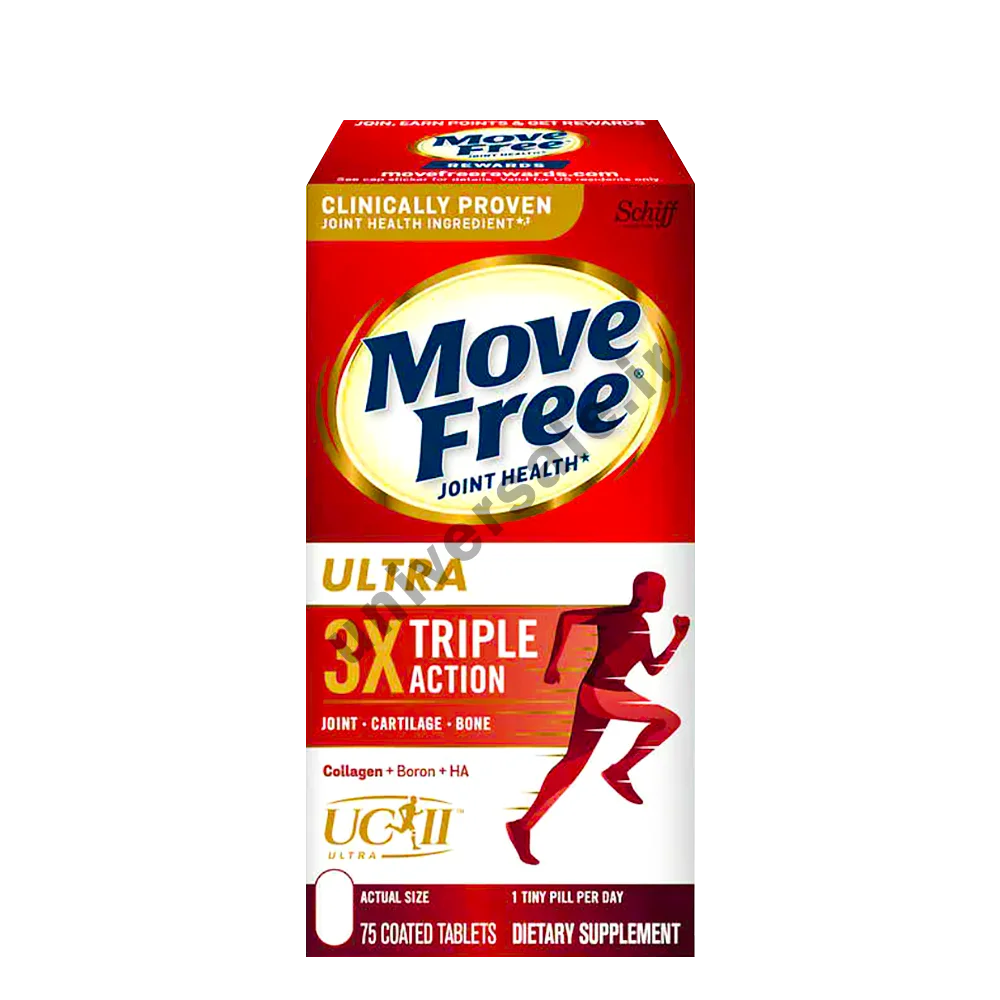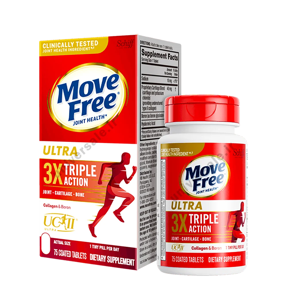 مووفری اولترا تریپل اکشن Move Free Ultra Triple Action یکی از بهترین و مؤثرترین مکملهای مفاصل، استخوان و غضروف در دنیا است که توسط برند معتبر Schiff تولید میشود. این محصول با ترکیب منحصربهفردی از کلاژن نوع ۲، بورون و هیالورونیک اسید (Hyaluronic Acid) طراحی شده تا به طور همزمان از مفاصل، غضروفها و استخوانها محافظت کند.اگر به دنبال بهترین مکمل برای سلامت مفاصل، کاهش درد و بهبود تحرک هستید، Move Free Ultra Triple Action همان انتخاب کاربردیترین و مؤثرترین محصول برای شماست.