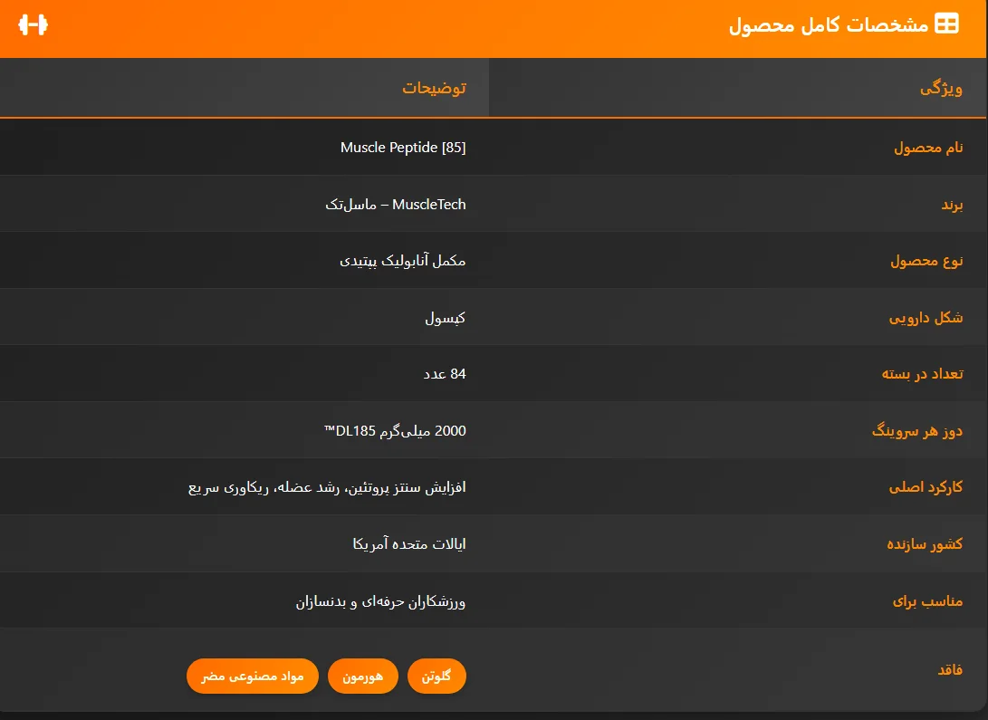 ماسل پپتید ماسل تک MuscleTech Muscle Peptide [185] از موثرترین مکملهای آنابولیک طبیعی برای رشد عضله و افزایش حجم خشک است.این محصول با استفاده از پپتیدهای آنابولیک تحقیقاتی (Research-Grade Peptide) و دوز دقیق DL185™ طراحی شده تا سنتز پروتئین عضلانی را تا 159٪ افزایش دهد.فرمول خاص و علمی ماسل پپتید باعث فعالسازی فرآیند رشد طبیعی عضله و بازسازی سریعتر فیبرهای عضلانی بعد از تمرین میشود.