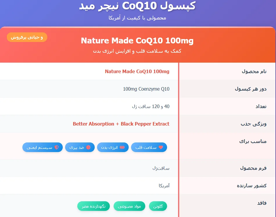 - 100 میلیگرم CoQ10 خالص در هر کپسول