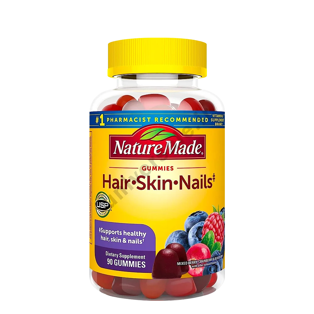 هیر اسکین نیلز نیچرمید تقویت مو پوست و ناخن Nature Made Hair Skin Nails Gummies یکی از موثرترین مکملهای گامیز مخصوص تقویت مو، پوست و ناخن است که توسط برند معتبر آمریکایی Nature Made تولید میشود.این محصول با ترکیبی قدرتمند از بیوتین، ویتامین C، ویتامین E و آنتیاکسیدانها طراحی شده تا بهطور علمی باعث:افزایش رشد مو | بهبود کیفیت و درخشندگی پوست | تقویت ناخنها و جلوگیری از شکنندگی می شود.
