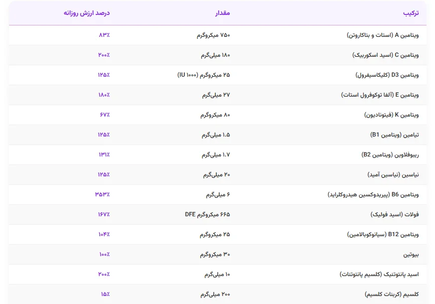 A.این مولتیویتامین مخصوص بانوان، با ۲۲ ریزمغذی ضروری از جمله ویتامینهای B، ویتامین C، ویتامین D و ویتامین E فرموله شده است تا پشتیبانی تغذیهای روزانه برای زنان بالای ۵۰ سال فراهم کند. مناسب برای سلامت قلب، ایمنی بدن