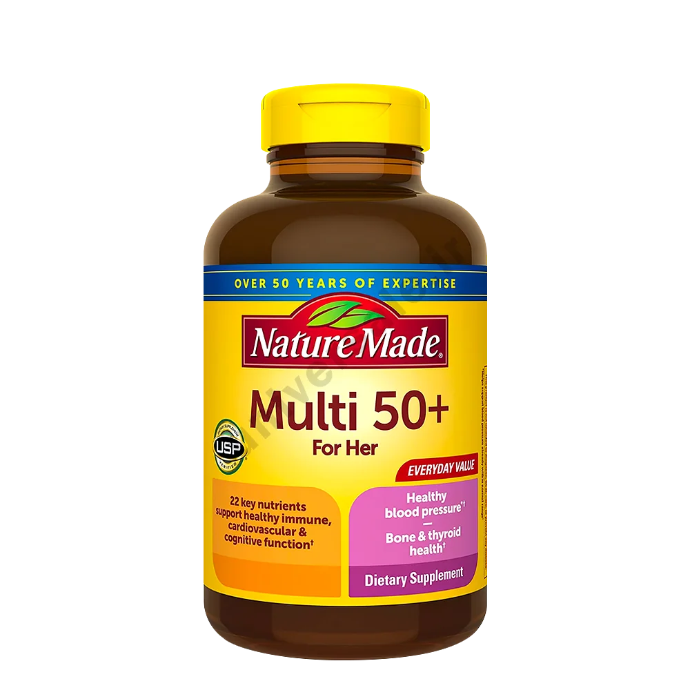 مولتی ویتامین زنانه نیچرمید بالای ۵۰ سال Nature Made Multi 50+ For Her یکی از موثرترین مولتیویتامینهای مخصوص بانوان بالای ۵۰ سال است که توسط برند معتبر نیچرمید تولید شده است.این محصول برای رفع کمبودهای تغذیهای، حمایت از سیستم ایمنی، تقویت استخوانها، بهبود عملکرد قلب، حفظ انرژی روزانه و پشتیبانی از سلامت تیروئید طراحی شده است.