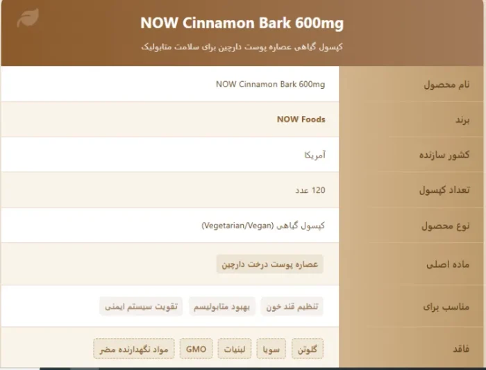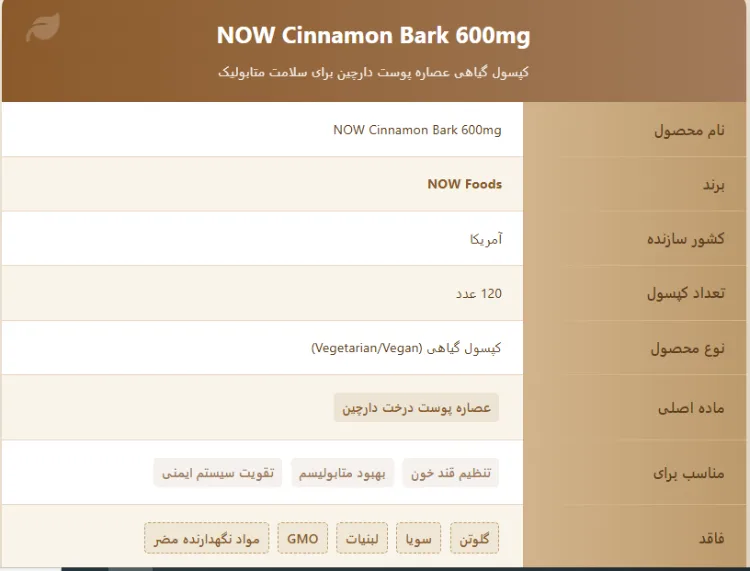 این مکمل با برند معتبر NOW که یکی از بهترین برندهای مکمل در جهان است، تولید شده و کیفیت آن توسط آزمایشگاههای مستقل تأیید شده است. اگر به دنبال یک مکمل موثر برای مدیریت طبیعی قند خون و بهرهمندی از خواص آنتیاکسیدانی دارچین هستید، خرید سینامون بارک ناو میتواند تغییری چشمگیر در سلامت شما ایجاد کند!
