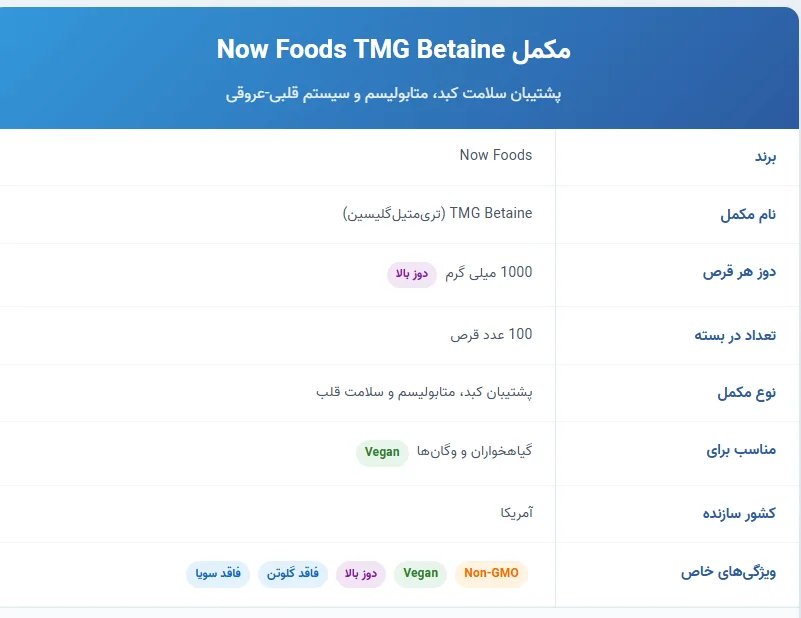 تی ام جی ناو فودز تری متیل گلیسین Now Fodds TMG Betaine یکی از بهترین و موثرترین محصولات برند معتبر Now Foods است که با ترکیب بتائین (Trimethylglycine) ساخته شده و به عنوان یک پشتیبان قوی برای سلامت کبد، قلب و متابولیسم بدن شناخته میشود. این مکمل به صورت قرص گیاهی طراحی شده و برای افرادی که به دنبال ارتقاء سلامتی عمومی، کاهش سطح هموسیستئین و بهبود عملکرد سلولی هستند، انتخابی کاربردیترین و هوشمندانه محسوب میشود.