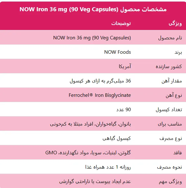 2.تقویت سیستم ایمنی و سلامت عمومی بدن ,مناسب برای دوران قاعدگی، بارداری (با مشورت پزشک) و شیردهی .NOW از فرم آهن بیس گلیسینات (Ferrochel) استفاده میکند که جذب بالاتری داشته و به خوبی تحمل میشود، زیرا ملایم است و باعث یبوست نمیشود.