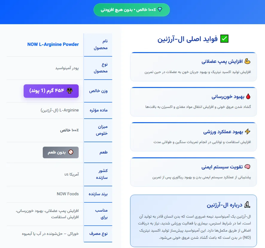 A.پودر ۱۰۰٪ خالص L-Arginine ,فاقد طعمدهنده، رنگ و افزودنیهای مصنوعی ,کمک به افزایش نیتریک اکساید و پمپ عضلانی قوی