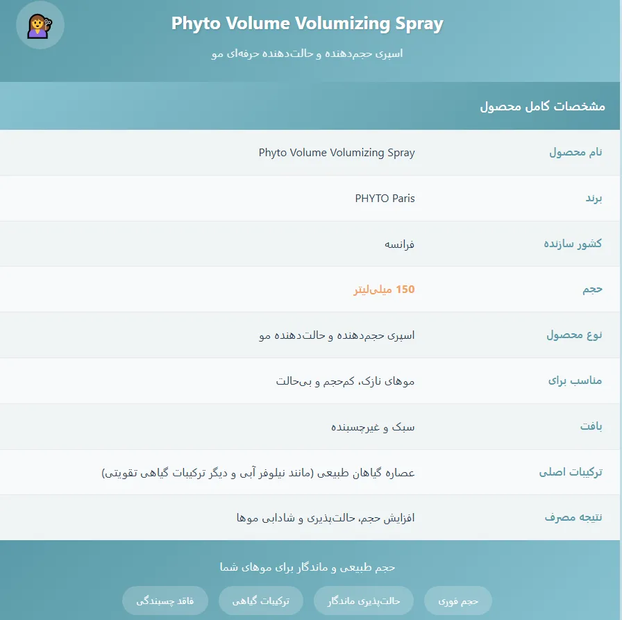 اسپری حجم دهنده فیتو واقعاً معجزه کرد! موهام پرپشتتر شده و حالت خوبی گرفته، خیلی راضیم ازش