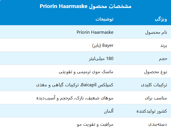ماسک مو پریورین بایر 180 میلی لیتر اصلی Priorin® Haarmaske یکی از موثرترین و بهترین محصولات تقویتی و ترمیمی مو است که توسط برند معتبر بایر (Bayer) تولید شده است. این محصول با فرمولاسیون پیشرفته و ترکیب اختصاصی Baicapil-Komplex طراحی شده تا بهطور ویژه به موهای ضعیف، نازک و آسیبدیده کمک کند.ماسک پریورین به افزایش حجم مو تا 60 درصد و کاهش شکنندگی مو تا 97 درصد کمک کرده و آن را به یکی از کاربردیترین ماسکهای موی تخصصی در بازار جهانی تبدیل کرده است.